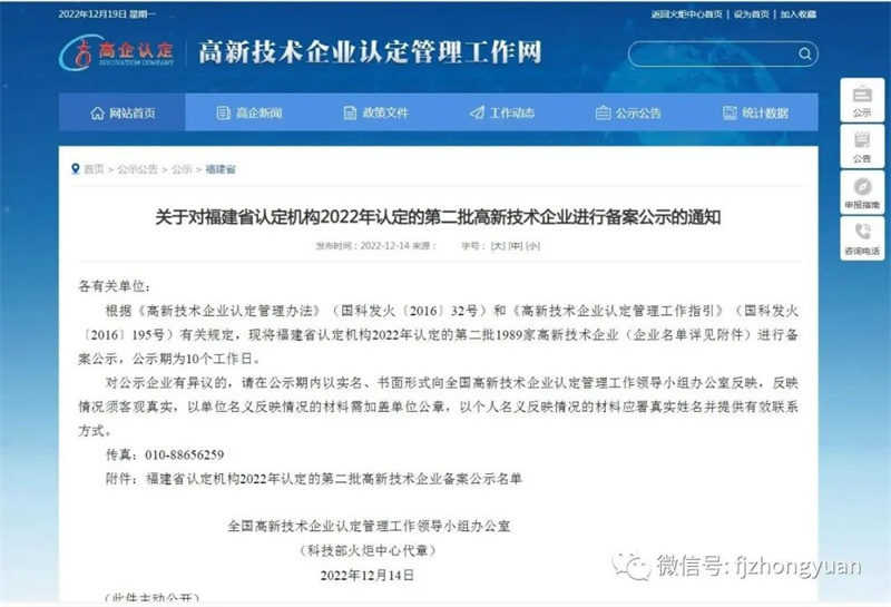 近日,全國高新技術企業認定管理工作領導小組辦公室發布根據《高新技術企業認定管理辦法》(國科發火〔2016〕32號)和《高新技術企業認定管理工作指引》(國科發火〔2016〕195號)有關規定,發布了福建省認定機構2022年第二批1989家高新技術企業的備案公示。其中,福建省眾源機械有限公司以其多年來持續不斷的研發投入及科技成果轉化能力獲得認可,位列其中。